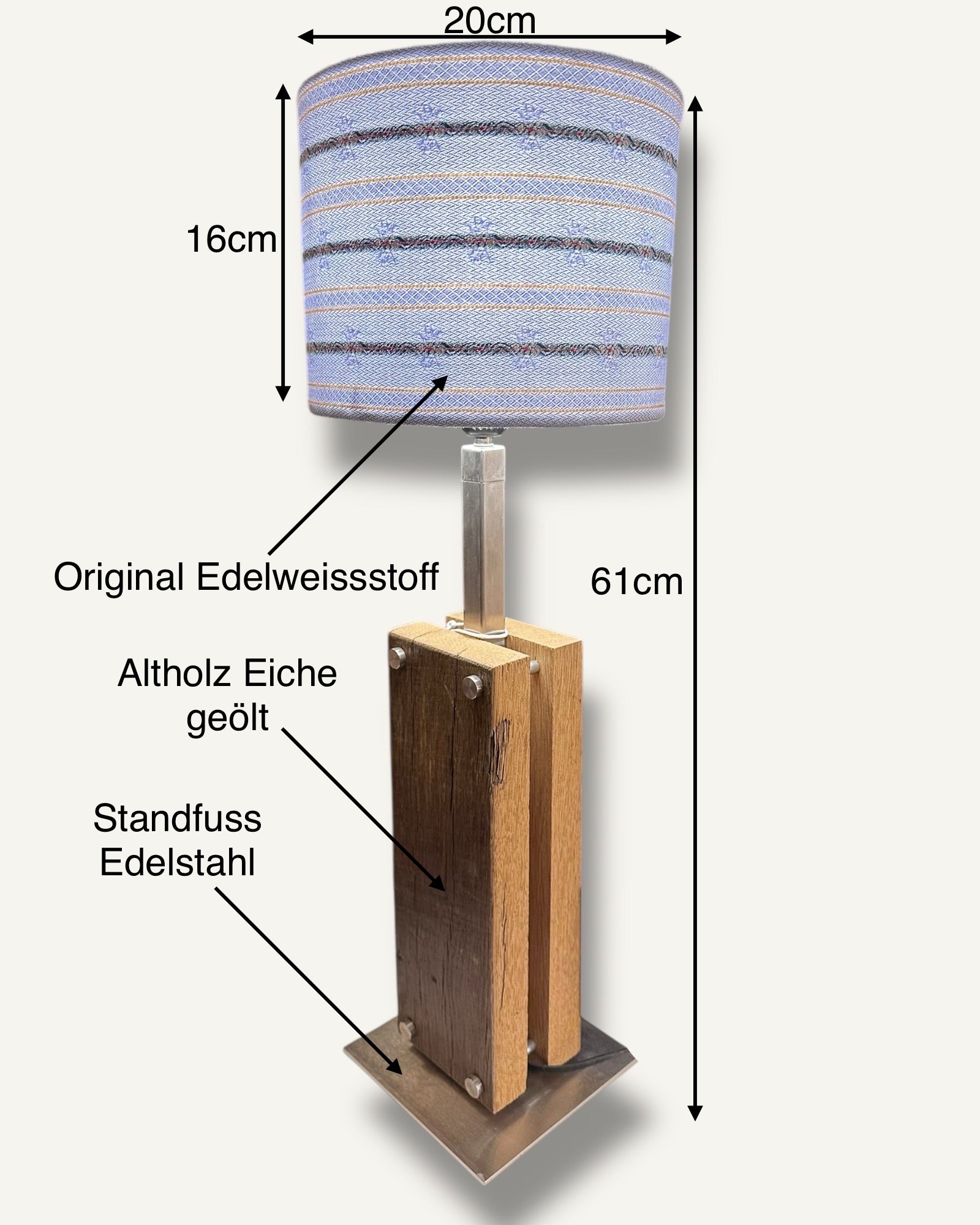 Tischlampe aus Altholz Eiche, Lampenschirm mit original Schweizer Edelweiss-Stoff