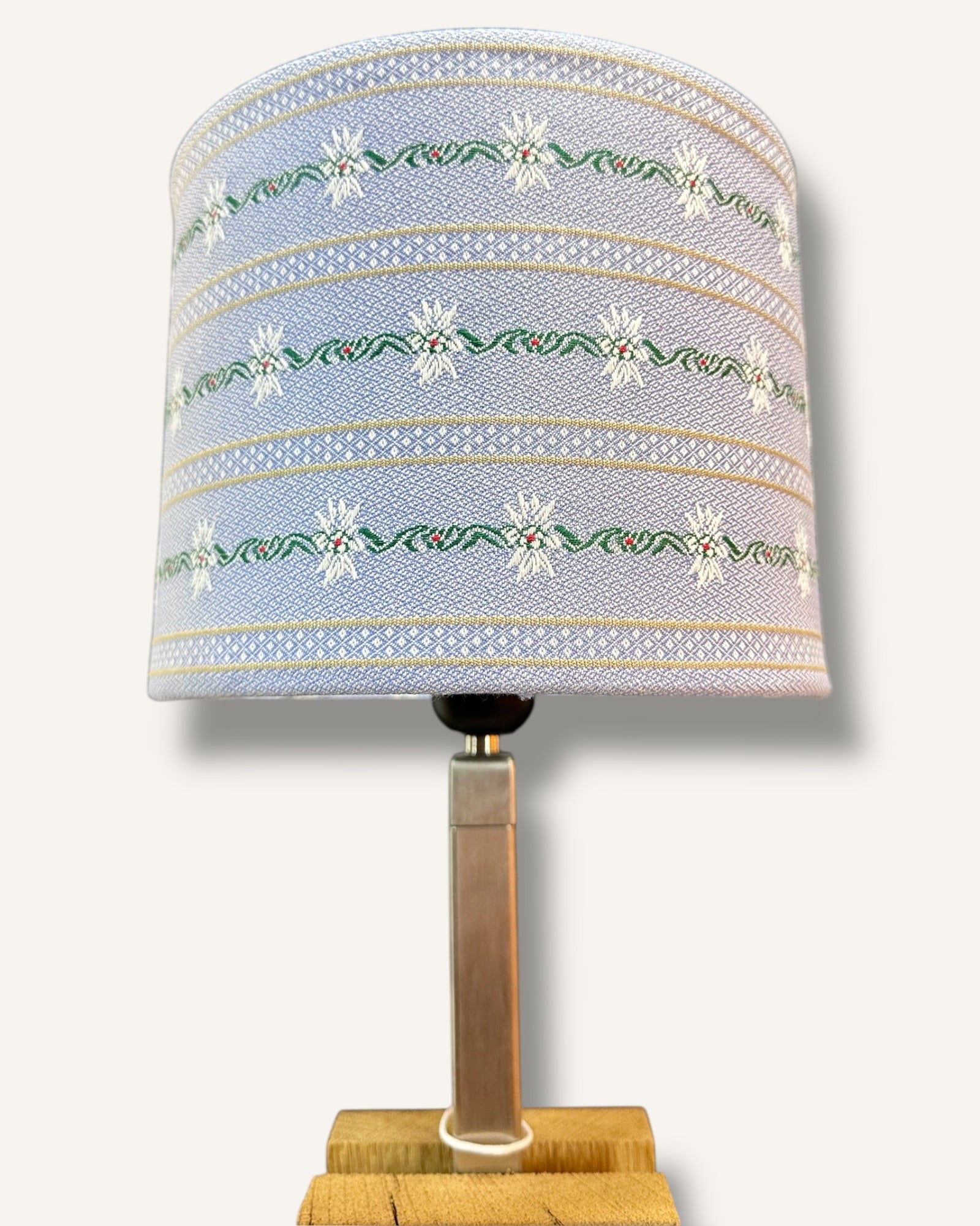 Auch der Lampenschirm wurde in aufwendiger Handarbeit aus dem originalen Edelweiss Stoff gefertigt. So entsteht ein harmonisches Zusammenspiel aus Naturmaterialien und stilvollem Design.
