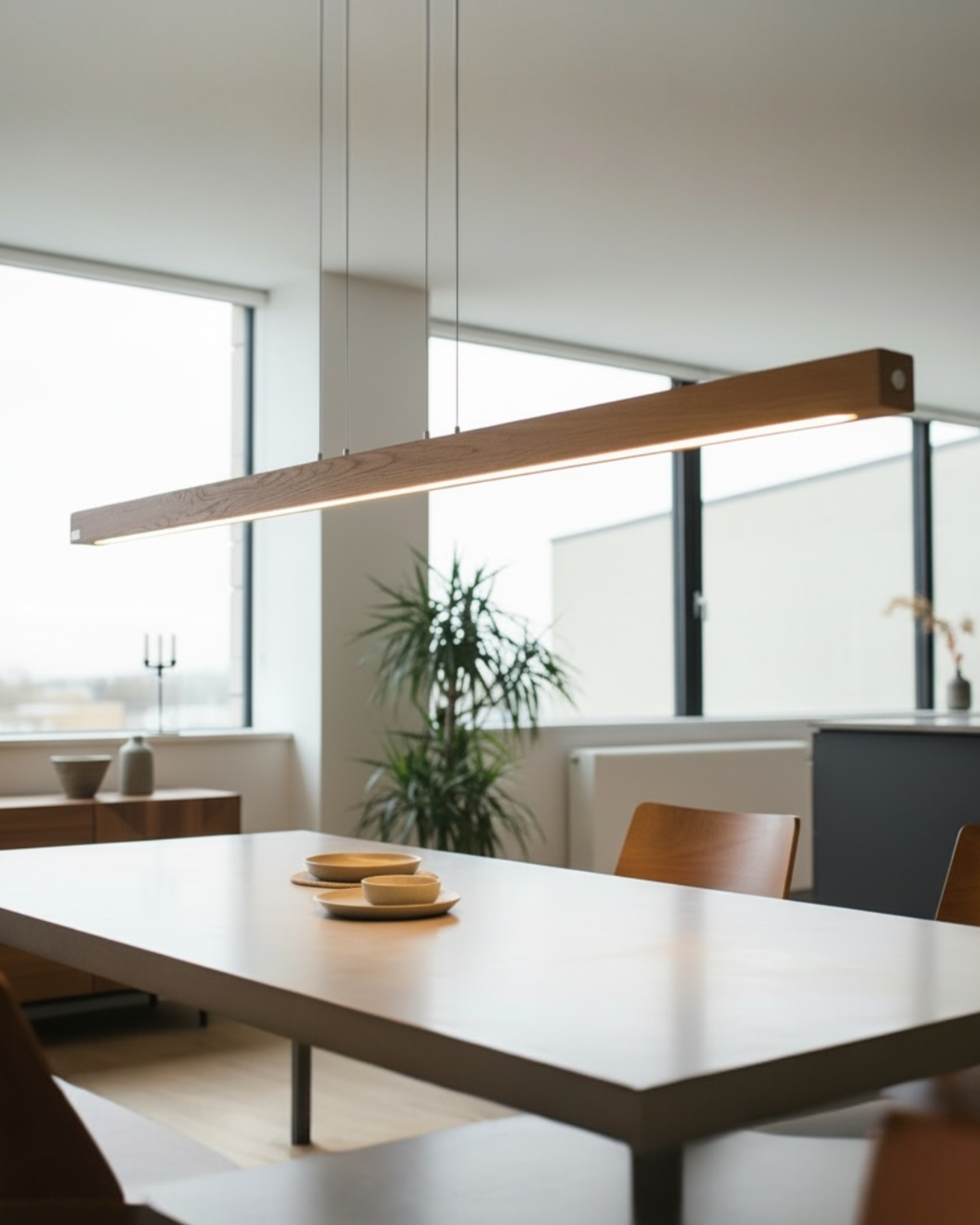 Mit einer Länge von 200 ist diese Pendelleuchte perfekt für Ihren Esstisch bis zu einer Länge von 250 geeignet. Sie schafft eine warme und einladende Atmosphäre, während Sie Ihre Mahlzeiten genießen. Ebenfalls lässt sich die Leuchte per integriertem Seillift individuell in der Höhe verstellen.