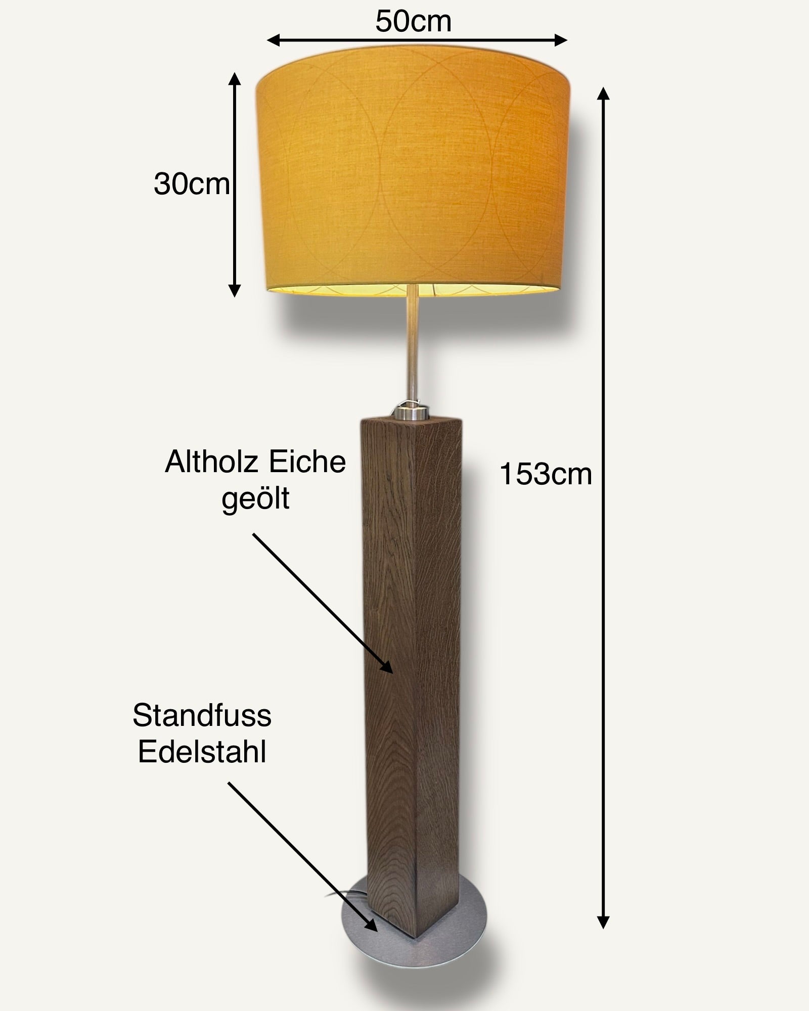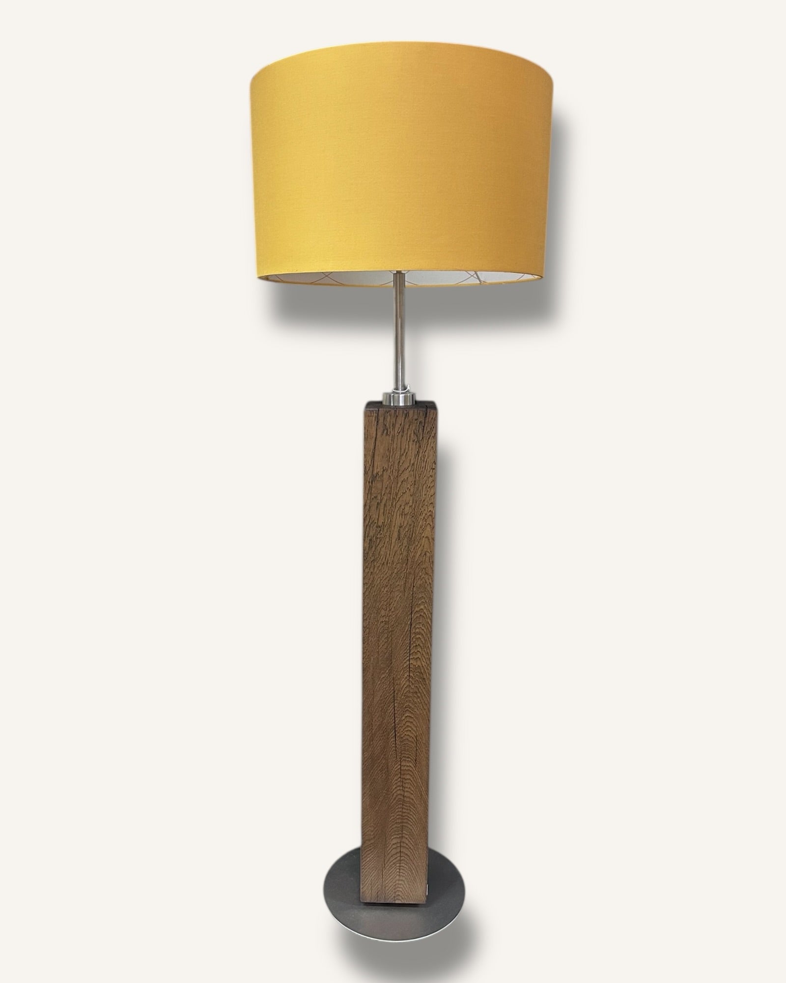 Stehlampe aus Altholz Eiche mit rundem gelbem Lampenschirm