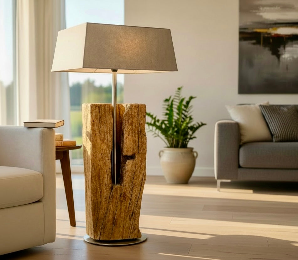 Altholz Eiche, Edelstahl gebürstet, Lampenschirm Chintz grau